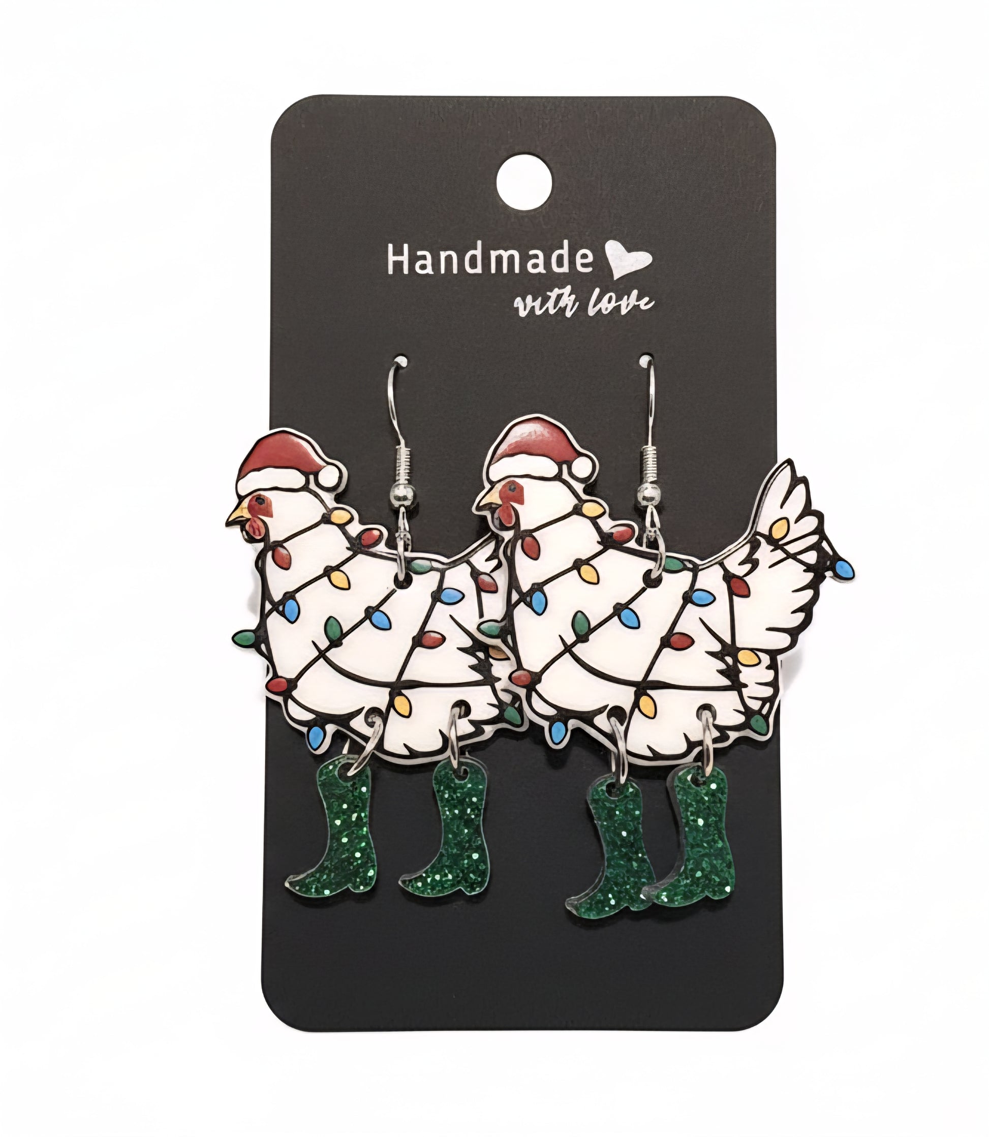 "Get ready to cluck around in festive style with our Green Gumboot Christmas Chickens! These quirky and playful chickens are sure to make you stand out this holiday season with their fun green boots. Perfect for any Christmas gathering or for adding some whimsy to your home decor. (No chickens were harmed in the making of these boots.)"