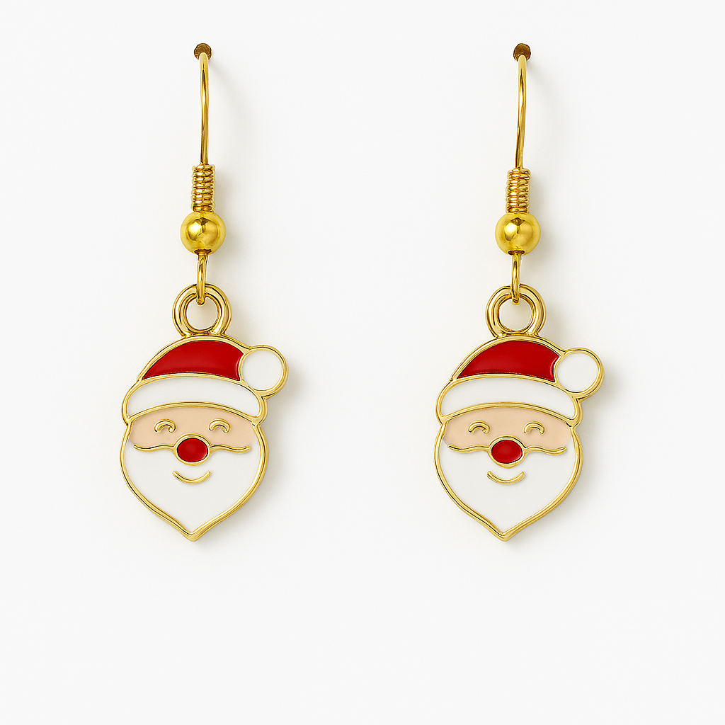 Celebrate the season with these cheerful Santa Claus Earrings. Each charm features Santa’s smiling face, complete with a red hat, white beard, and rosy cheeks—all outlined in gold-tone metal. Suspended from gold-tone fishhook ear wires, these earrings are lightweight, festive, and perfect for holiday parties, seasonal gifting, or cozy winter styling.