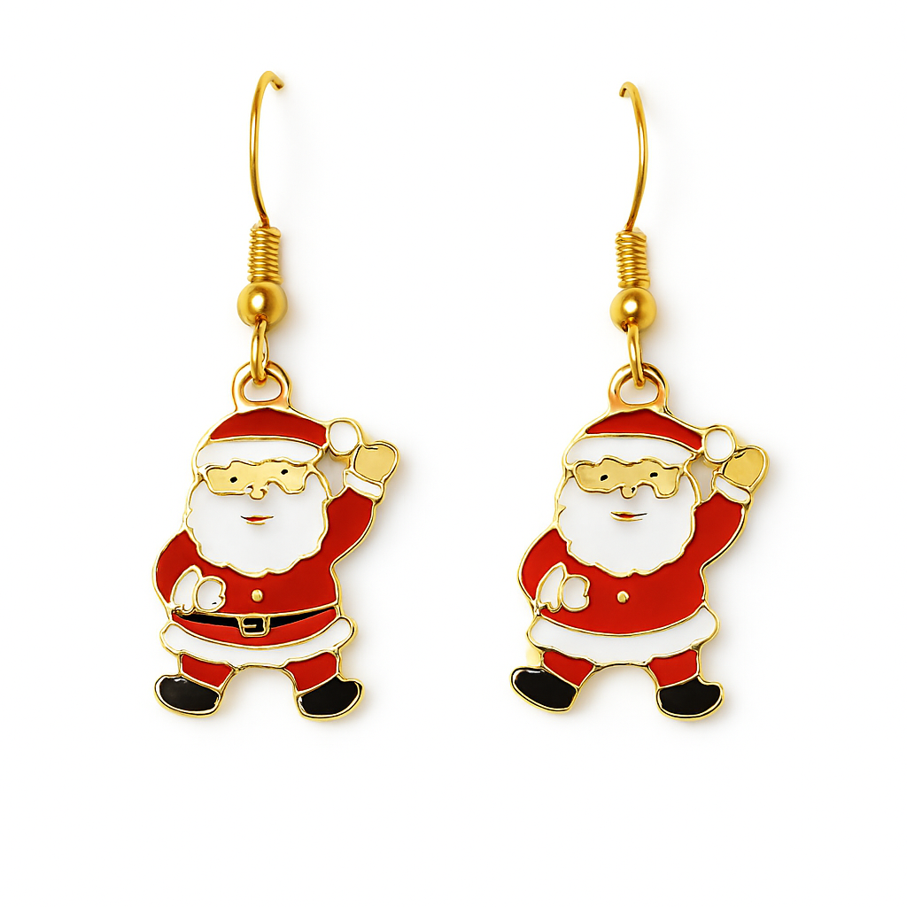 Bring the magic of the season to your ears with these cheerful Santa Claus Earrings. Each earring features a vibrant enamel charm of Santa in his classic red suit, waving with joy. The charms are suspended from gold-tone hooks, making them lightweight and easy to wear. Whether you're heading to a holiday party or wrapping up gifts, these earrings add a playful touch to any festive outfit.